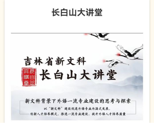 此次“长白山大讲堂”活动,根据我省《全面深化“四新”建设,加快推进本科教育提质创新发展行动计划(2021-2023)》安排,经省教育厅同意,由长春师范大学举办。这是吉林省继2021年12月,第二次为提质外语类新文科团队建设和人才培养,而举办的论坛活动。学校教务处和学院高度重视,认真组织院、系(教研室)负责人、学科专业带头人、专任教师,共81人参加(观看)了“长白山大讲堂”外国语言文学类的系列讲座。