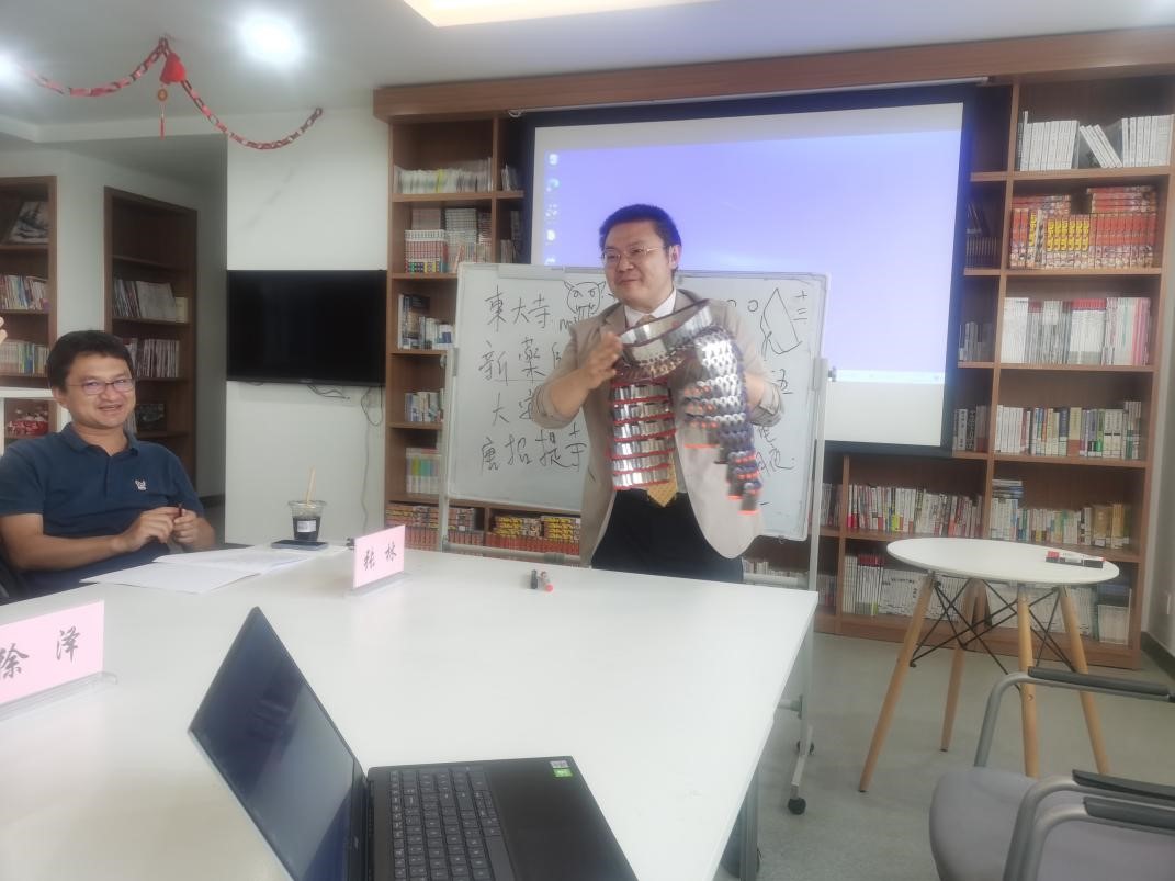 图二:公司日语系主任宋卓时在分科会上展示其亲手制作的古代铠甲部件复原品