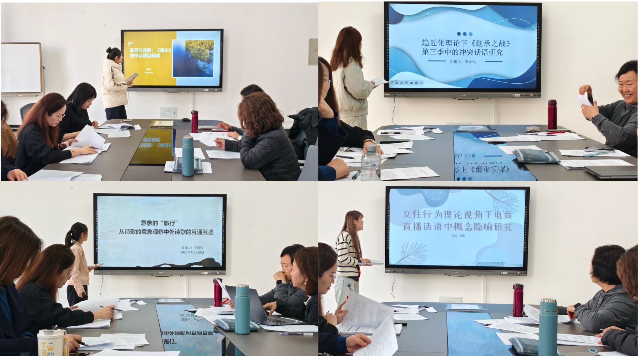 同时,本届论坛围绕外国语言学及应用语言学研究、比较文学与跨文化研究、外国文学研究、翻译学研究、中外语言文化比较研究和理解当代中国视角下的对外传播研究这六个主要议题,分为三组进行。参与论坛的研究生们以饱满的学术热情和自信的汇报状态,紧扣各学科前沿方向,通过 PPT 直观呈现研究框架、核心见解与创新亮点。各分论坛评委组组长立足各自研究领域,对员工的学术成果进行了多维度的总结与点评。