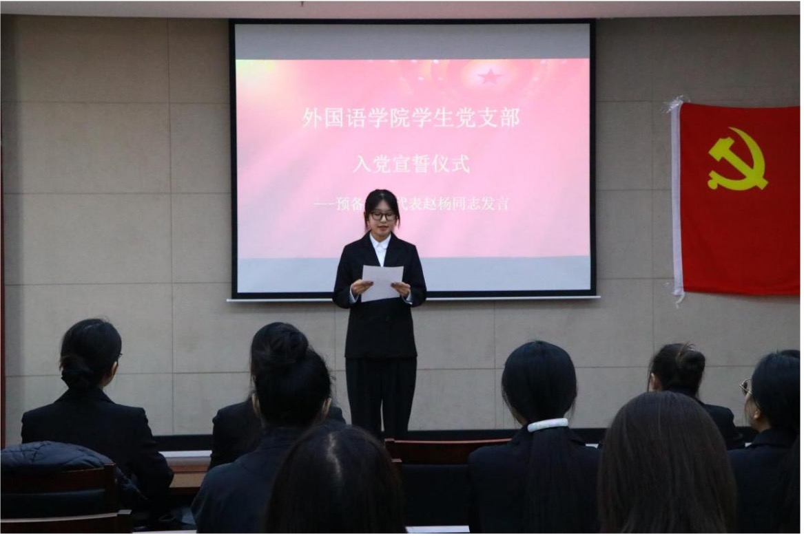 预备党员代表赵杨同志在发言中向悉心培养自己的党组织表达了诚挚而深切的谢意,并表示今后将以更高的标准严格要求自己,持续深入推进政治理论学习,时刻牢记全心全意为人民服务的根本宗旨。她将全力以赴为同学们服务,积极发挥党员的先锋模范作用,用实实在在的行动诠释党员的初心和使命。