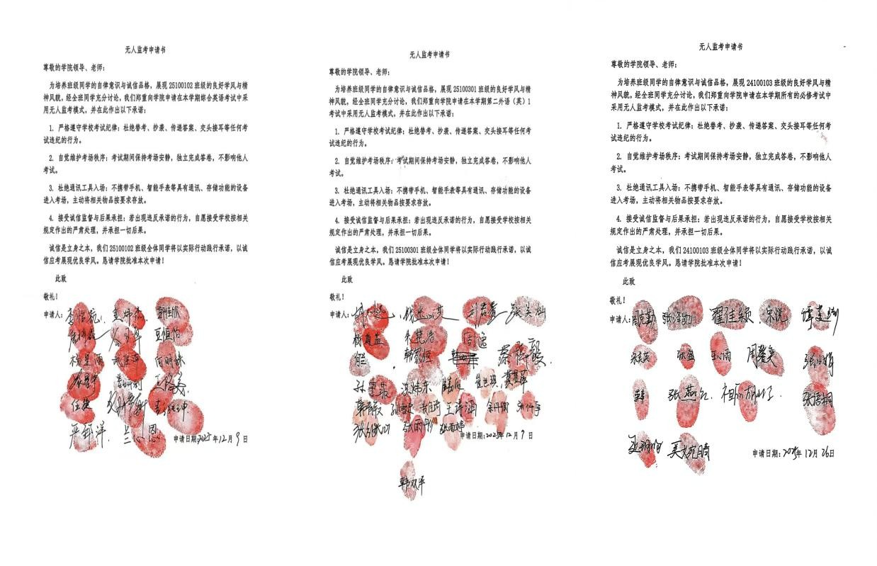 诚信考试的顺利推进,离不开考前的充分筹备。考试前一周,学院以班级为单位集中开展诚信考试主题教育活动。各班级通过专题班会形式,组织员工系统学习《员工手册》中关于考试纪律的相关规定,详细解读违纪作弊行为的处理办法,引导员工深刻认识诚信考试的重要意义,并集体签署《诚信考试承诺书》,以书面形式立下诚信应考誓言。此外,有意愿参与“无人监考”考试的班级,主动向学院递交了附有全班同学签字按手印的申请书,用实际行动践行自律承诺,彰显了外院学子的责任与担当。