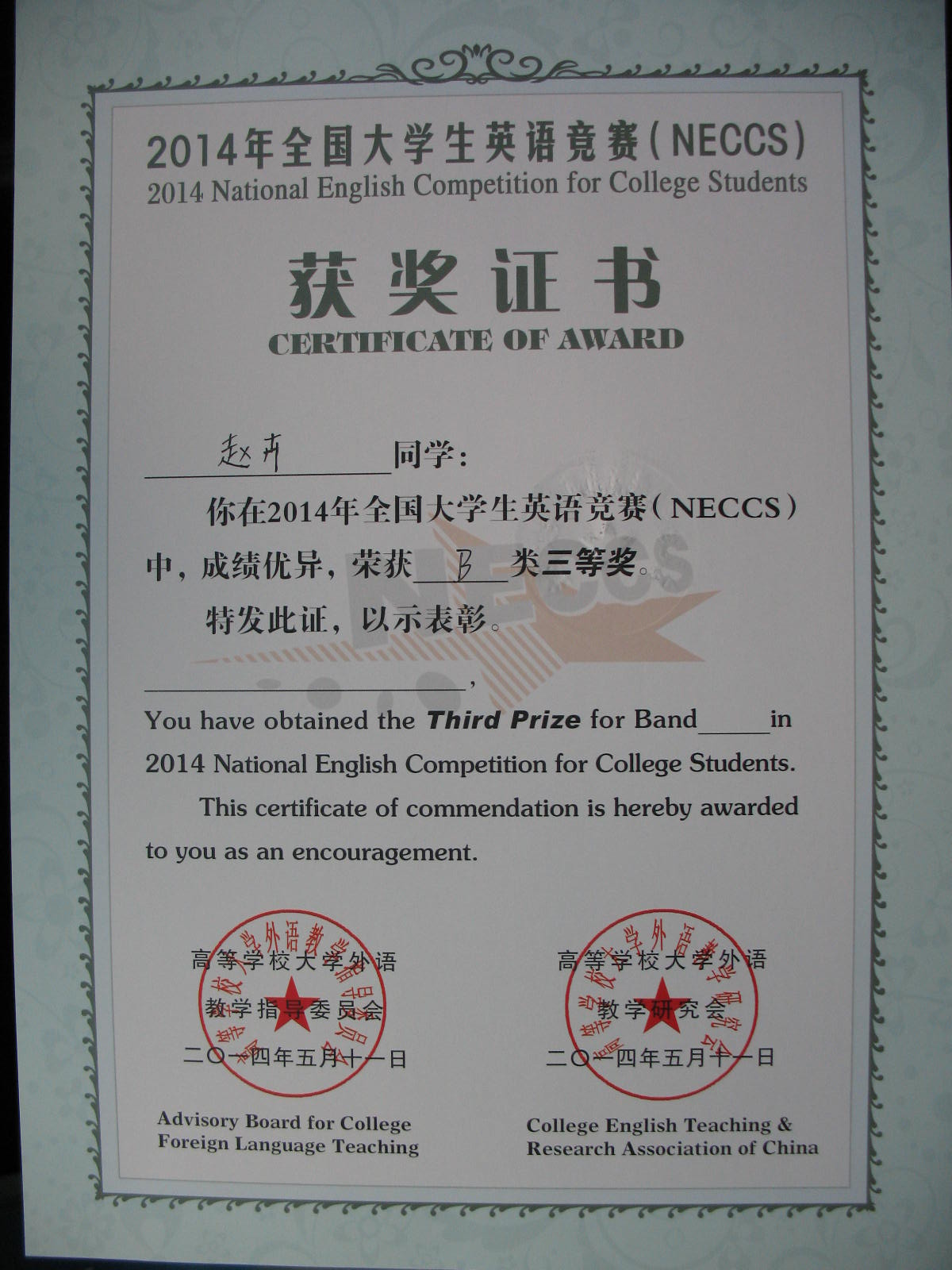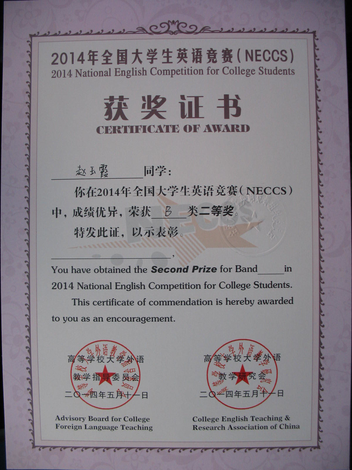 2014年5月11日yl1111永利集团赵卉同学获得“2014年全国老员工英语竞赛B类三等奖”