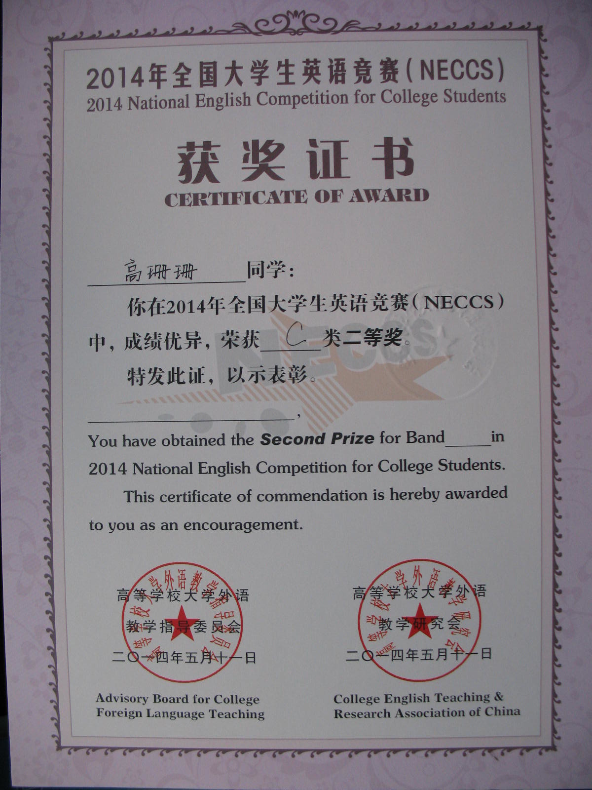 2014年5月11日yl1111永利集团高珊珊同学获得“2014年全国老员工英语竞赛C类二等奖”