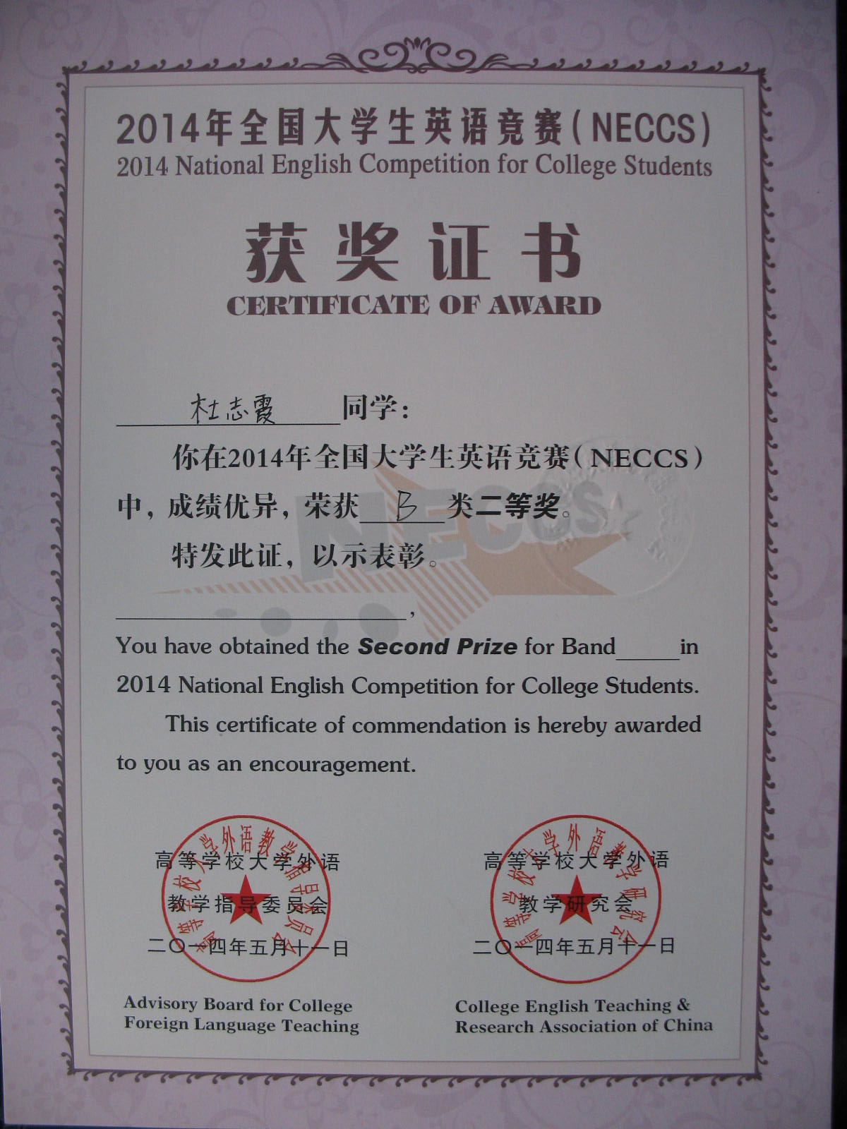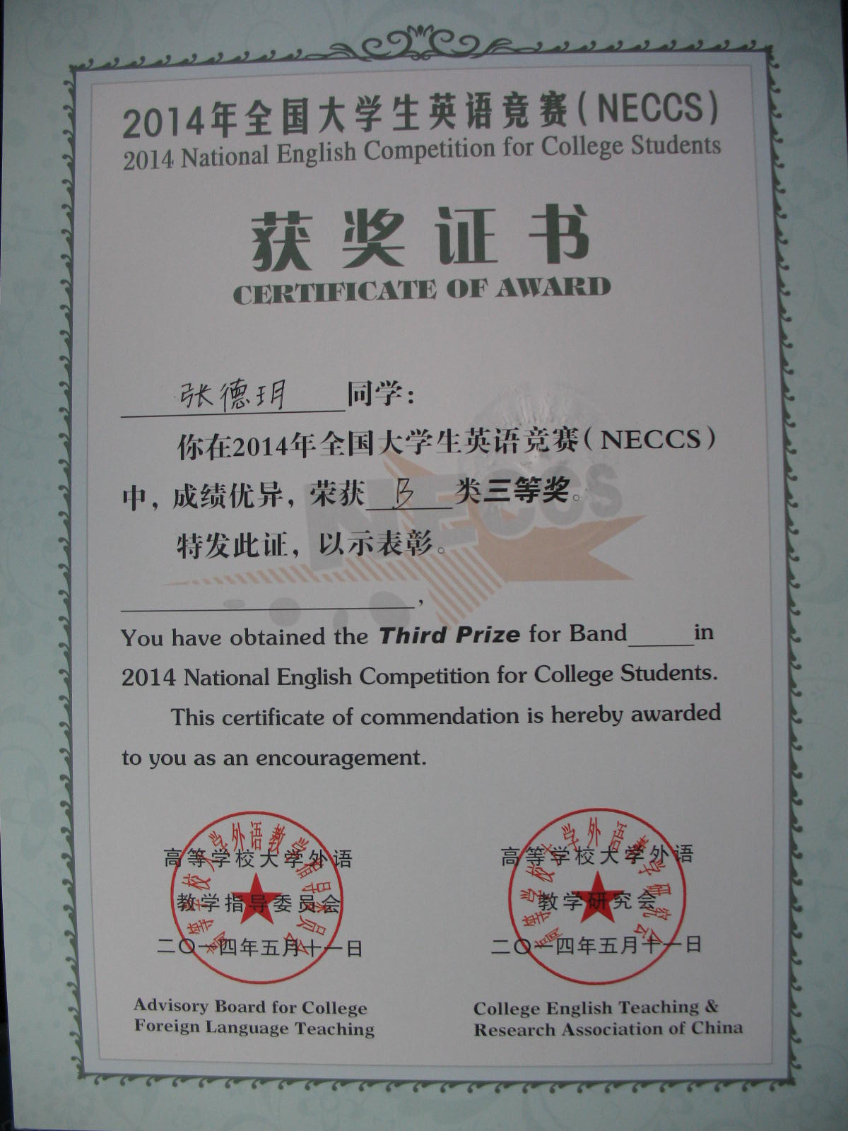 2014年5月11日yl1111永利集团张德玥同学获得“2014年全国老员工英语竞赛B类三等奖”