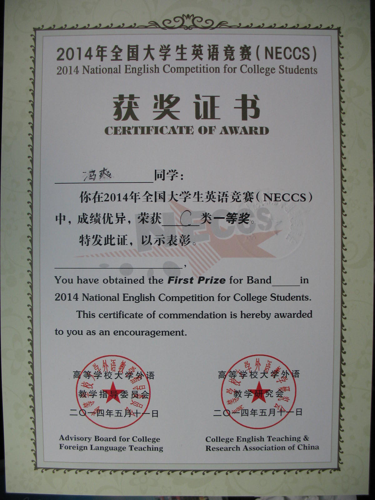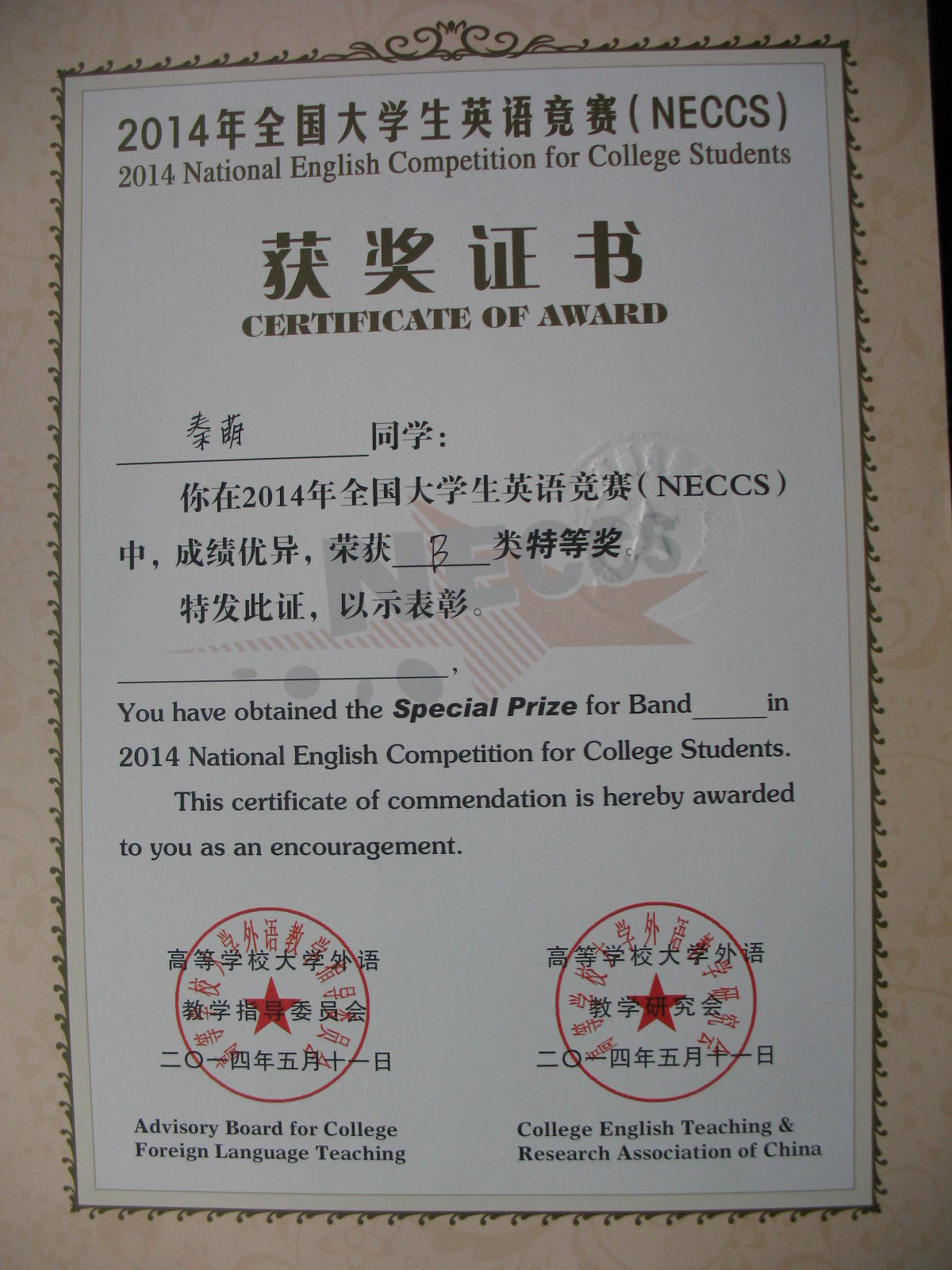2014年5月11日yl1111永利集团秦萌同学获得“2014年全国老员工英语竞赛B类特等奖”