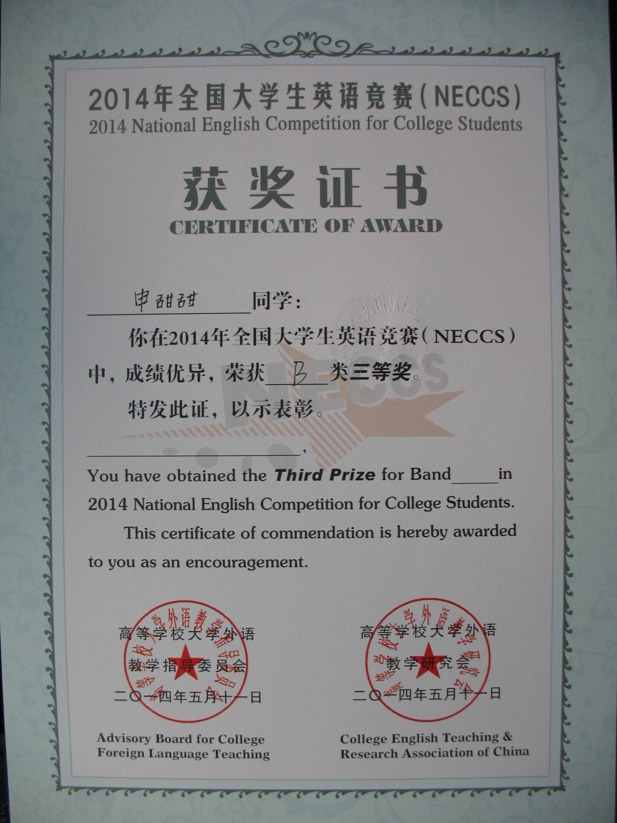 2014年5月11日yl1111永利集团申甜甜同学获得“2014年全国老员工英语竞赛B类三等奖”