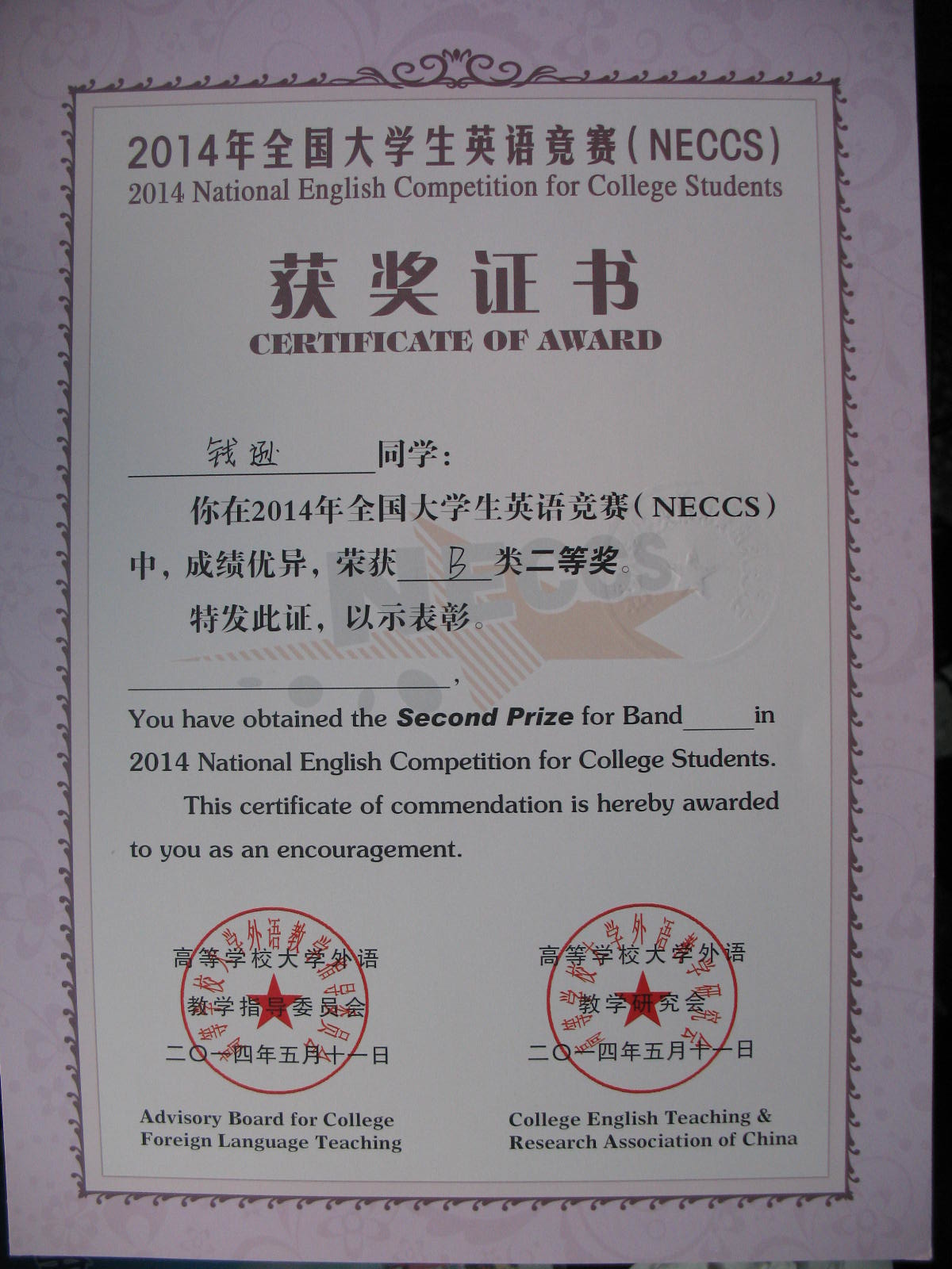 2014年5月11日yl1111永利集团钱逊同学获得“2014年全国老员工英语竞赛B类二等奖”