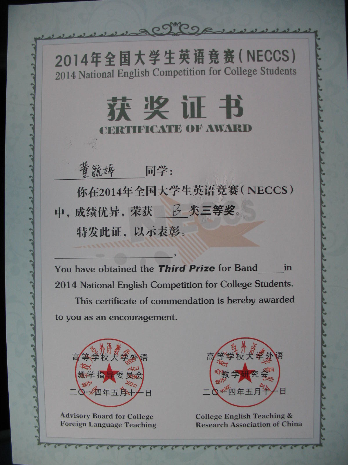 2014年5月11日yl1111永利集团董毓婷同学获得“2014年全国老员工英语竞赛B类三等奖”
