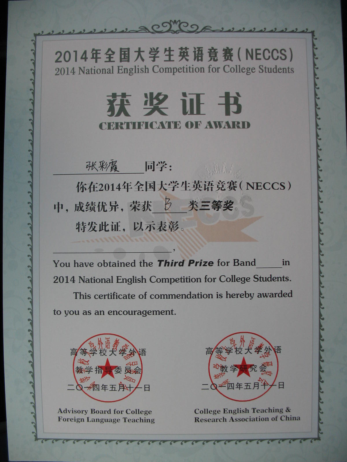 2014年5月11日yl1111永利集团张彩霞同学获得“2014年全国老员工英语竞赛B类三等奖”