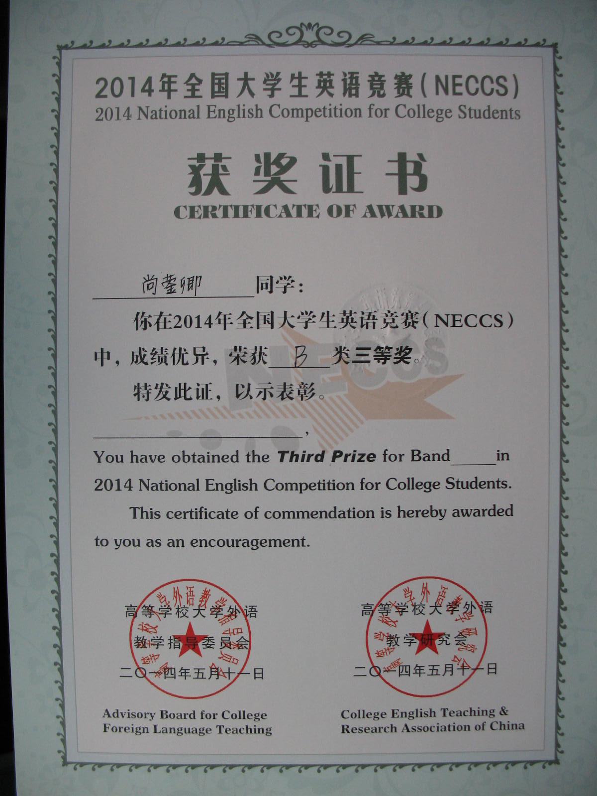 2014年5月11日yl1111永利集团尚莹卿同学获得“2014年全国老员工英语竞赛B类三等奖”