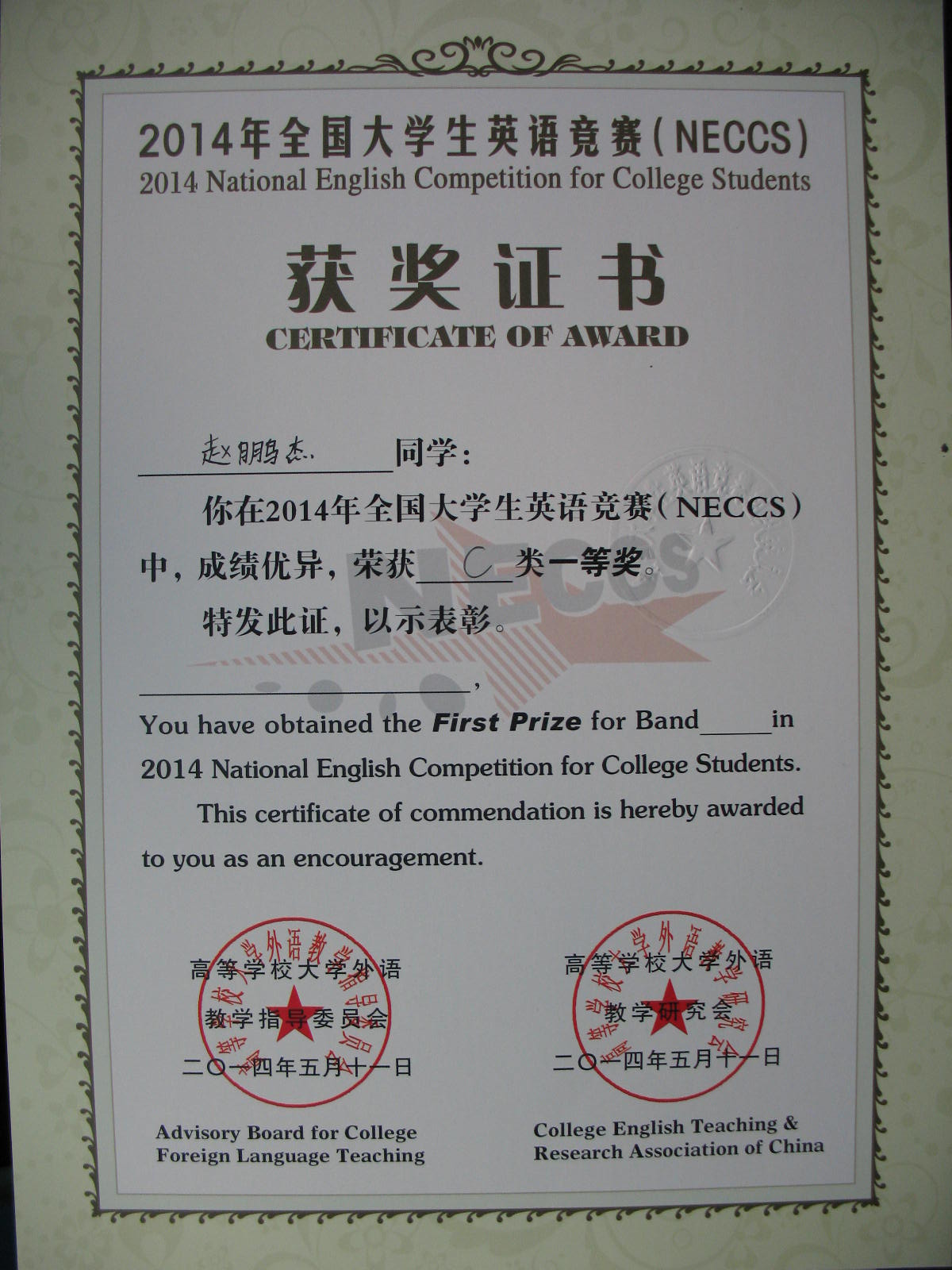 2014年5月11日yl1111永利集团赵鹏杰同学获得“2014年全国老员工英语竞赛C类一等奖”