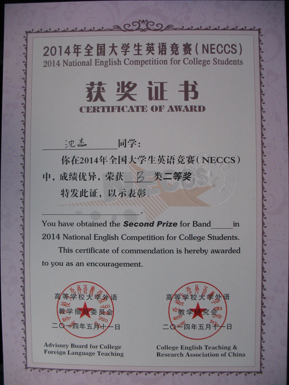2014年5月11日yl1111永利集团沈杰同学获得“2014年全国老员工英语竞赛B类二等奖”