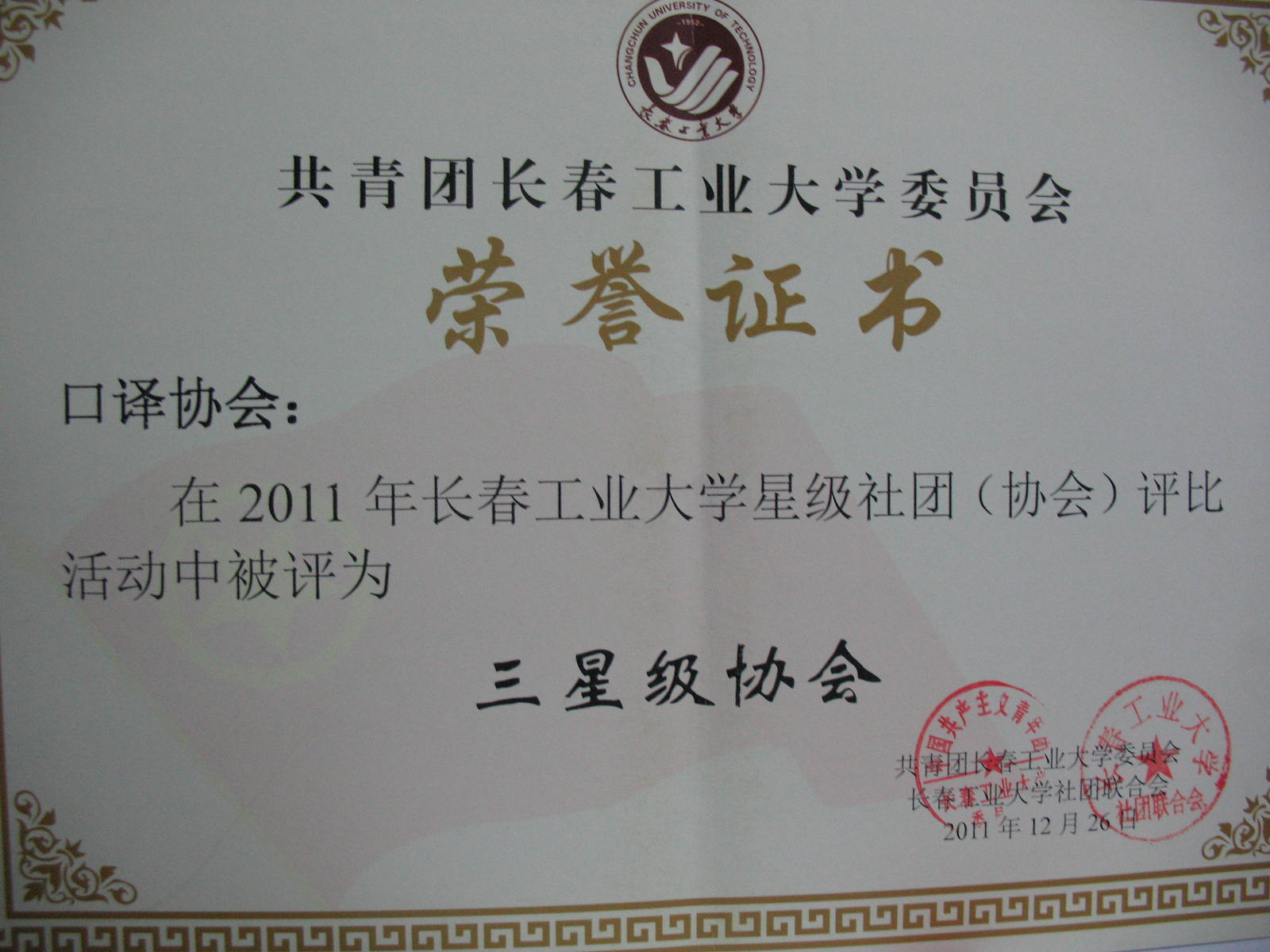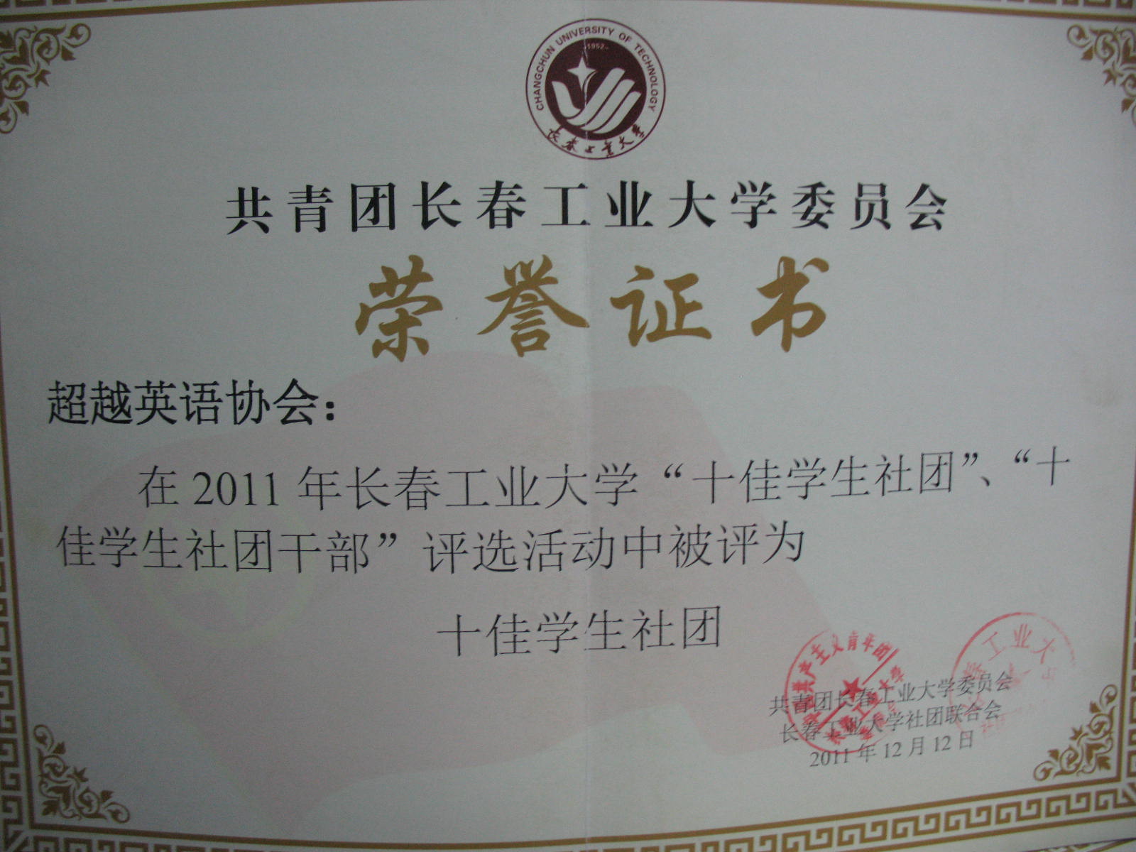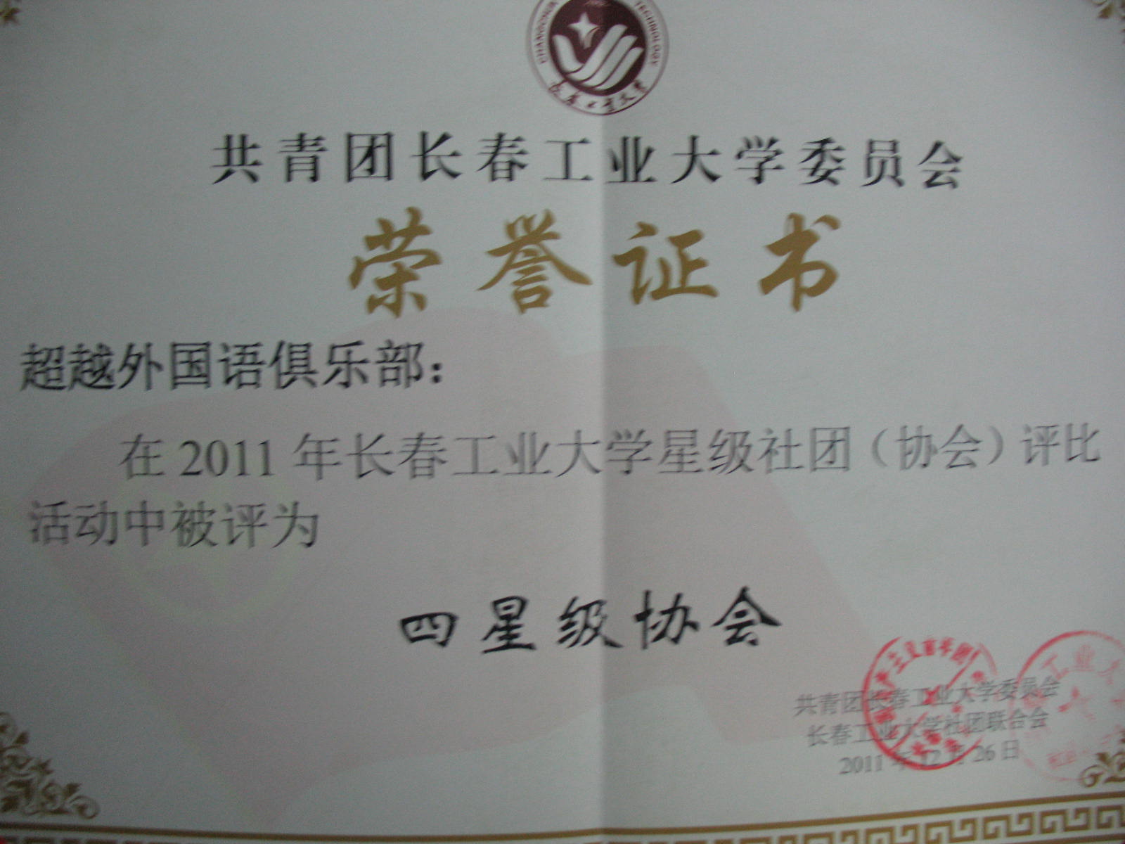 2011年12月26日超越英语俱乐部在2011年yl1111永利集团星级社团(协会)评比中获得“四星级协会”称号