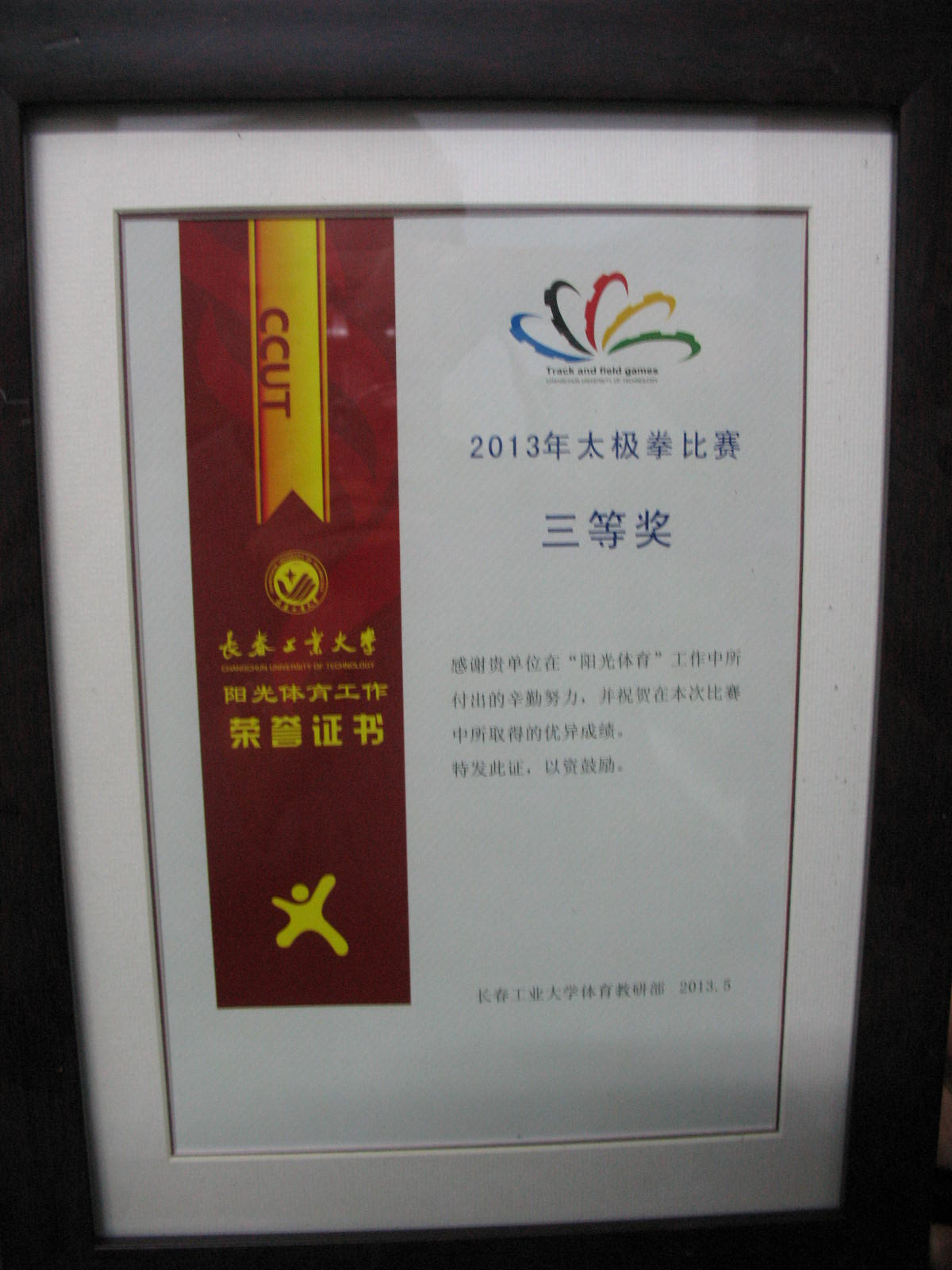 2013年5月yl1111永利集团获“阳光体育”太极拳比赛三等奖。