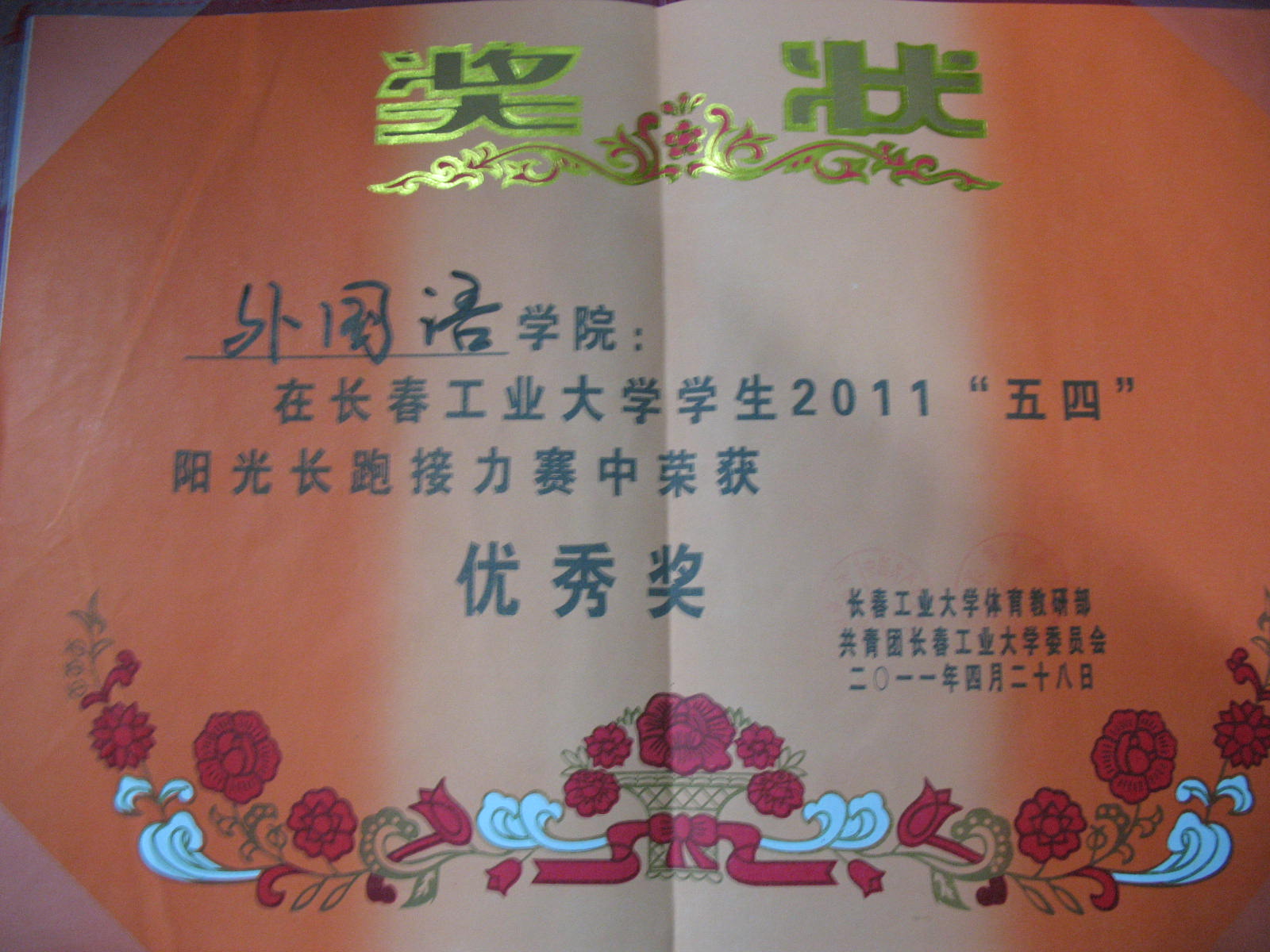 2011年4月28日yl1111永利集团再yl1111永利集团员工2011“五四”阳光长跑接力赛中荣获“优秀奖”。