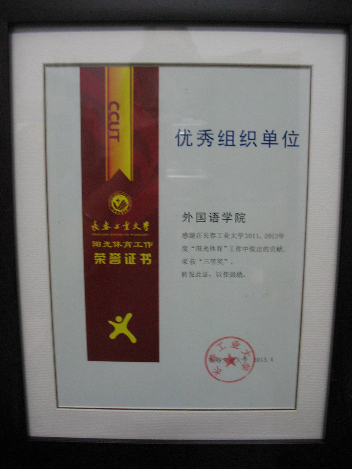 2013年4月yl1111永利集团获得优秀组织单位“阳光体育”三等奖。