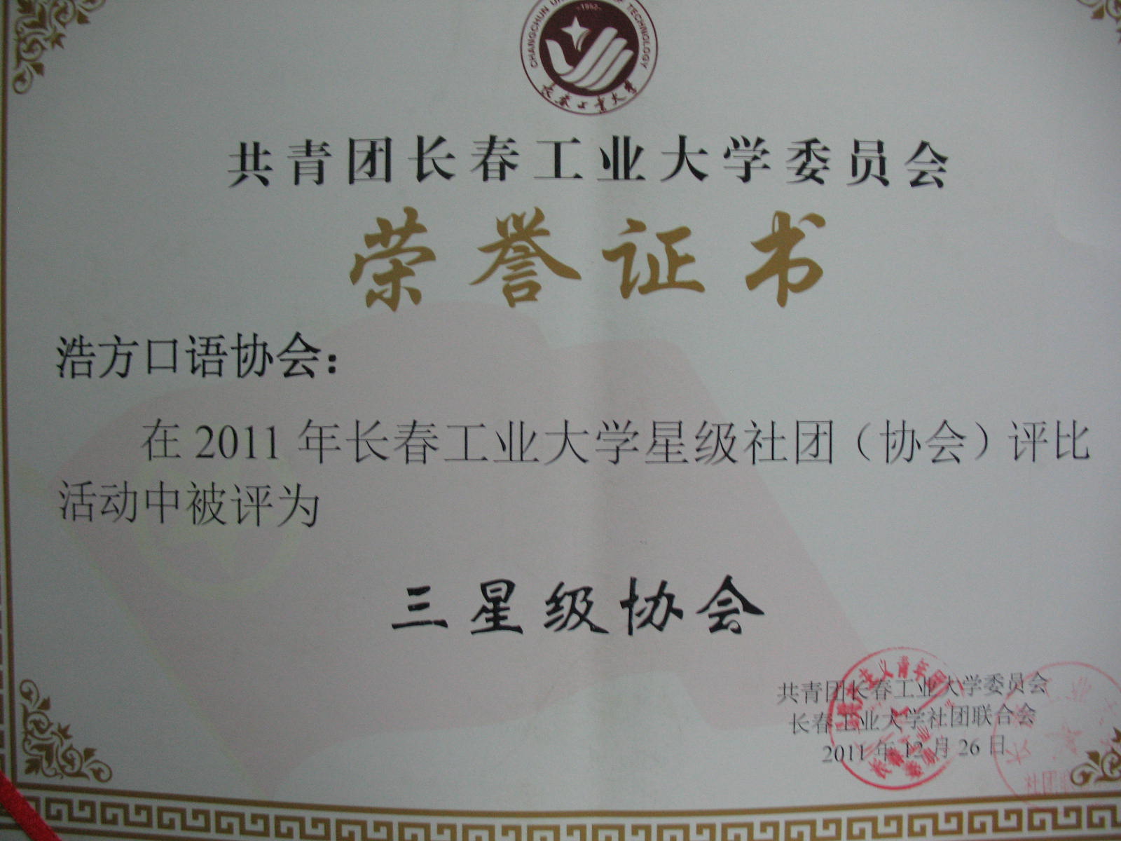 2011年12月26日浩方口语协会在2011年yl1111永利集团星级社团(协会)评比中获得“三星级协会”称号