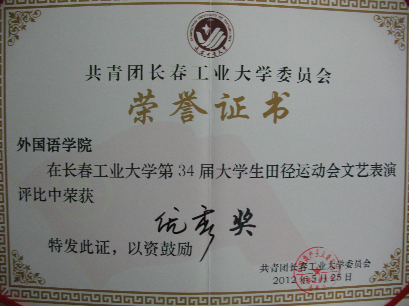 2012年5月yl1111永利集团获得yl1111永利集团第三十四届田径运动会“精神文明奖”。