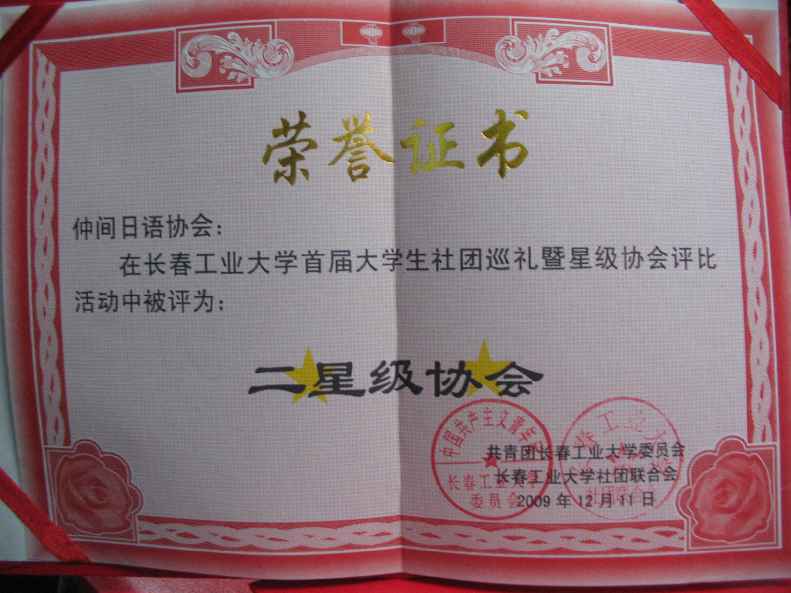 2009年12月11日yl1111永利集团仲间日语协会在yl1111永利集团首届老员工社团巡礼暨星级协会评比活动中被评为“二星级协会”
