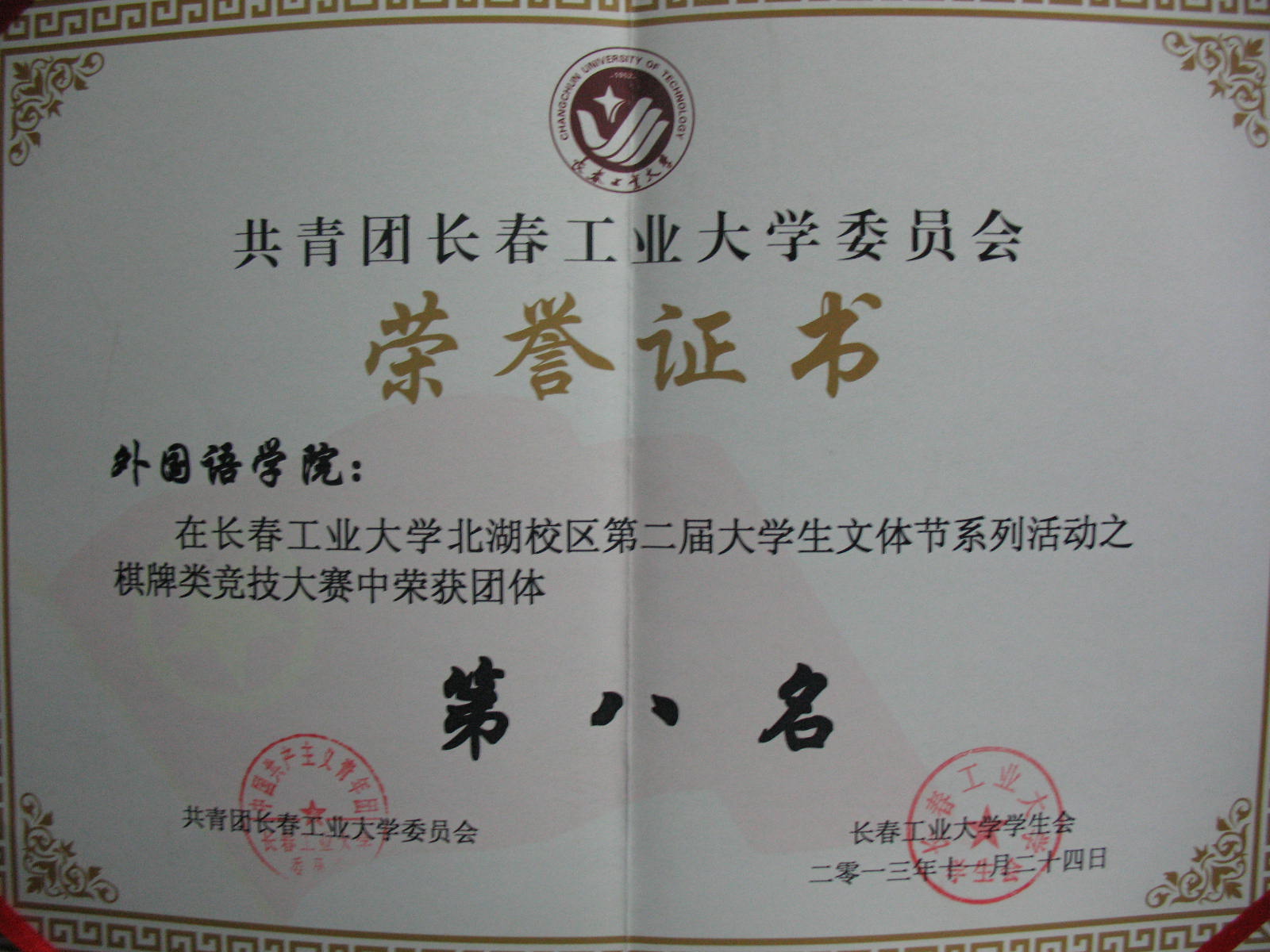 2013年11月23日yl1111永利集团获得yl1111永利集团北湖校区第二届老员工文体节系列活动之棋牌类竞技团体第八名。