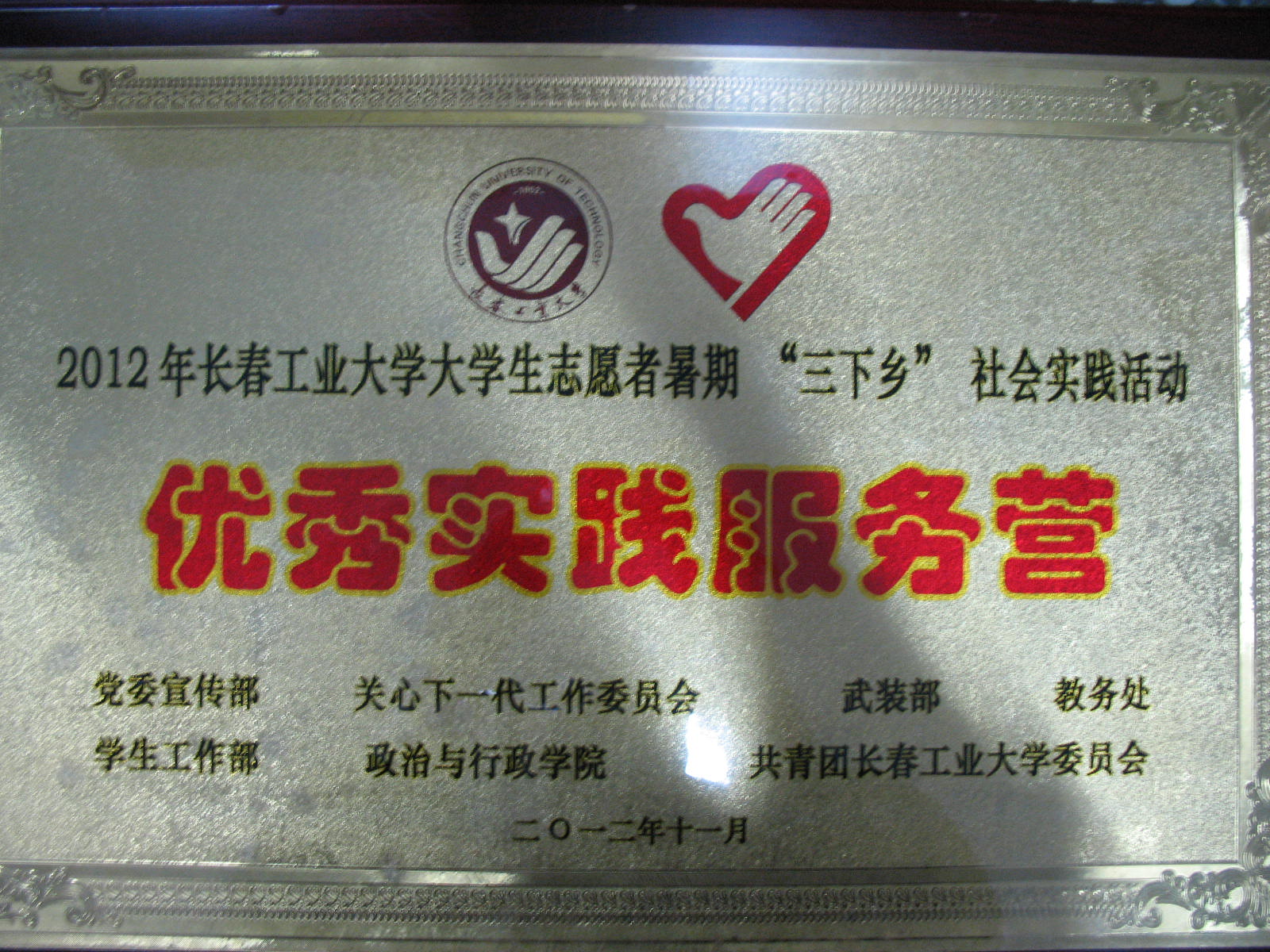 2012年11月yl1111永利集团分团委在 2012年yl1111永利集团老员工志愿者暑期“三下乡”社会实践活动中获得“优秀实践服务营”称号。