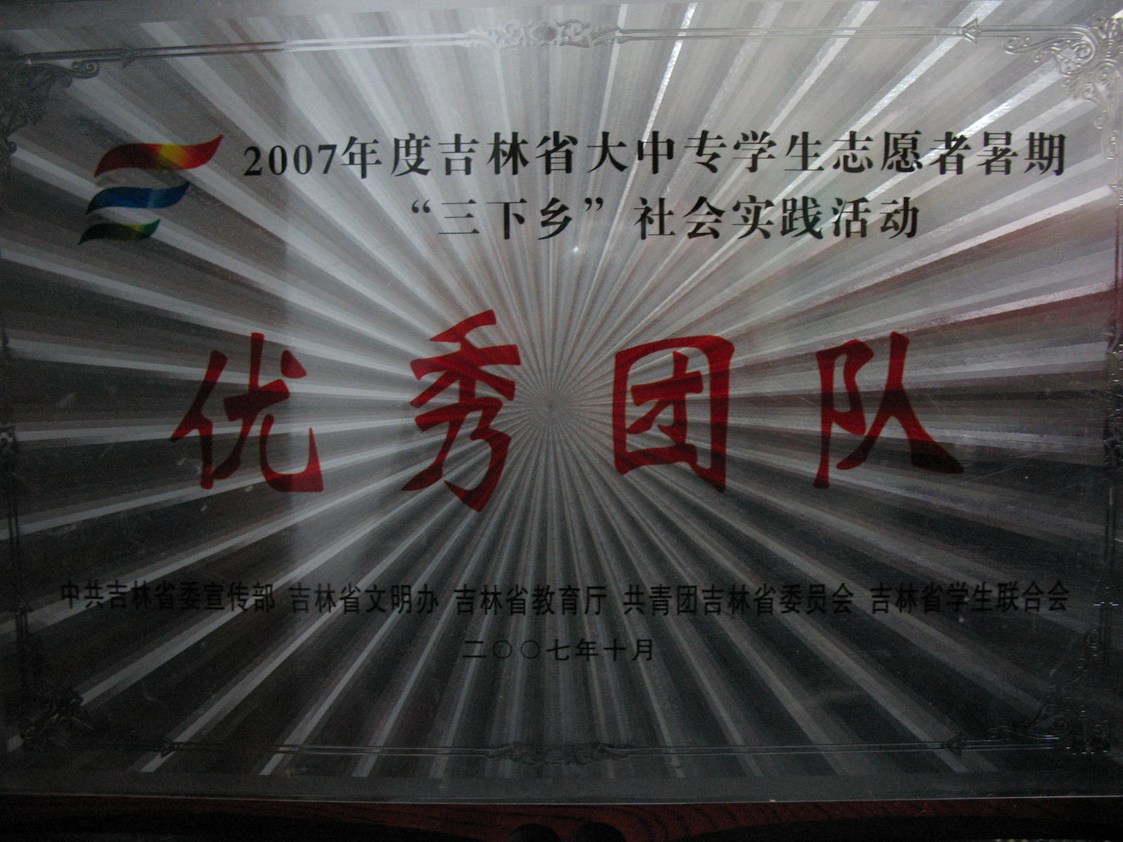 2007年10月yl1111永利集团分团委在2007年度吉林省大中专员工志愿者暑期“三下乡”社会实践活动中获得“优秀团队”称号。