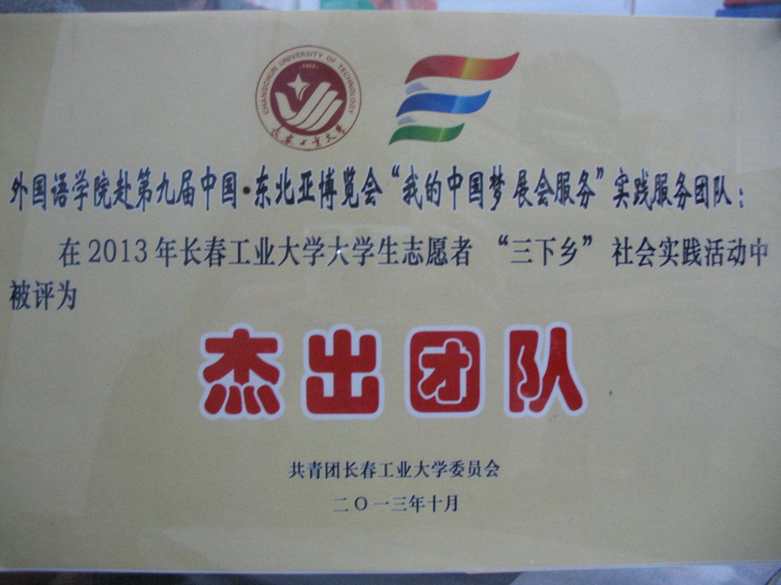 2013年10yl1111永利集团赴第九届中国·东北亚博览会“我的中国梦展会服务” 实践服务团队在2013年yl1111永利集团老员工志愿者暑期“三下乡”社会实践活动中被评为“杰出团队”。