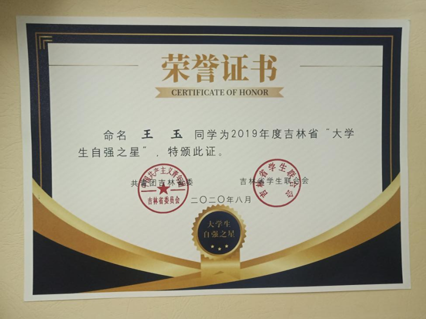在她十岁时,失去了自己的父母,此后一直就读于辽宁省孤儿学校,即使有这般不公平的命运,但她仍然自强不息,积极进取,为梦想而拼搏。非常荣幸,在2020年8月,她获得了吉林省2019年度“自立自强老员工”,这份荣誉对她来说是一份认可,更是一份激励。天行健;君子以自强不息,地势坤,君子以厚德载物。