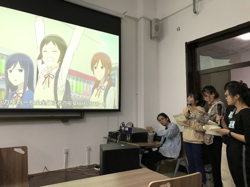 参赛选手分为七个小组,依次上场展示自己的配音水平。选材方面选取了《蜡笔小新》《超元气三姐妹》等日本动漫中的精彩片段,内容积极向上,充满了友情的碰撞;配音水平充分展现了同学们的学习成果,团队成员之间配合默契,角色表现力强。经过激烈角逐,赵鸿博等10名同学荣获“优秀配音个人奖”;第二组的段向佳、李嫒苹、李响同学荣获特等奖,其他同学分别荣获一、二、三等奖。