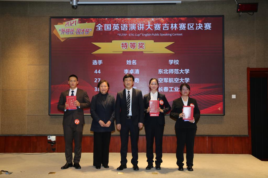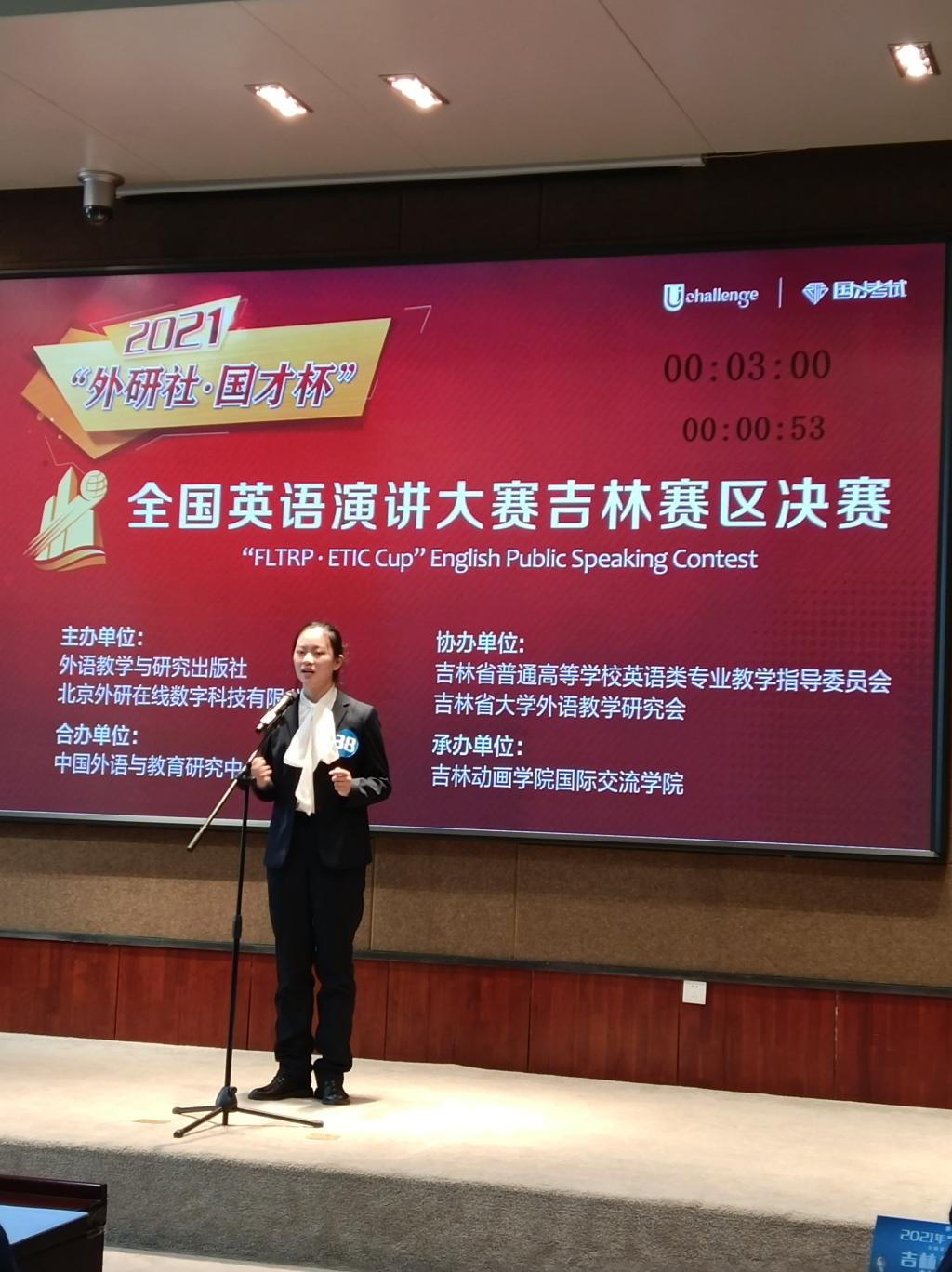 新闻网讯(通讯员 孙莉)10月30日,2021年“外研社·国才杯”全国英语演讲大赛吉林赛区决赛在吉林动画学院文化艺术中心隆重举行。经过8个小时的激烈角逐,公司公共外语教学部老师指导的王蕊同学从52名参赛选手中脱颖而出,荣获特等奖,并将与来自东北师范大学、空军航空大学的两名同学代表吉林省前往北京参加全国总决赛。