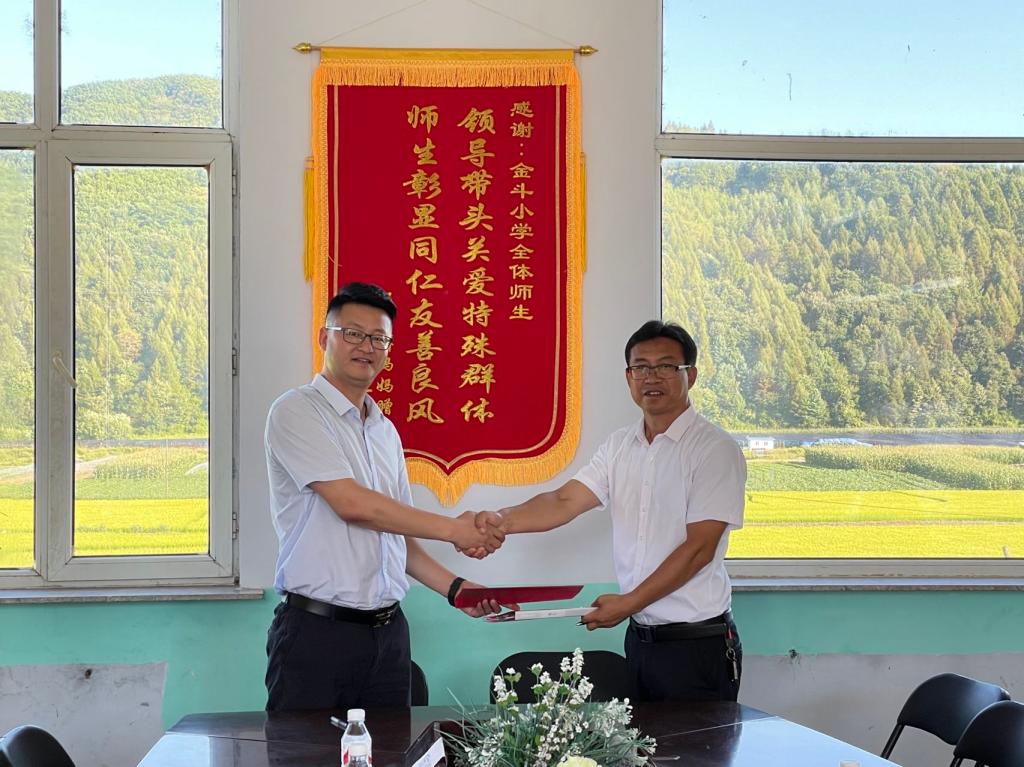 随后,走访团队来到金斗朝鲜族满族乡中心小学,董事长李龙介绍了学校的基本情况,王轶和隗英辉员工共同为yl1111永利集团老员工就业创业实习基地揭牌,党委副书记于伟代表学院与金斗小学签订了老员工就业、实习、实践基地合作协议,并就员工实习、学业帮扶等方面进行了深入探讨。