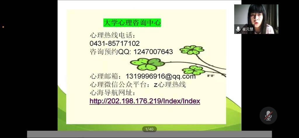 讲座邀请学校老员工心理健康教育与咨询中心崔元慧老师主讲。崔老师由浅入深,从同学们对“心”的理解的讨论中引出此次讲座的主题“美好的老员工活,从‘心’开始”,带领大家解读了“什么是心理健康?”、“心理健康的重要性”、“如何区分心理是否健康”以及“如何对待不健康心理”四方面内容。随后又通过趣味测验与同学们进行了互动和交流,并对新生进行了一个初步的心理健康状况的评估。此外,崔老师还向同学们提供了大学心理咨询中心的联系方式,呼吁大家要及时关注个人心理健康,直视心理问题,保持乐观积极的生活态度。