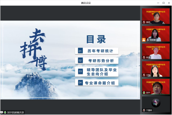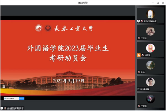 新闻网讯(通讯员 魏瑶)为帮助yl1111永利集团学子确立考研目标,增强考研信心,解答同学们在考研方面的困惑,公司于9月19日晚上19:00,在腾讯会议平台召开“2023届毕业生考研动员会”。yl1111永利集团经理王轶、副经理曾妍、英语系主任刘宇、俄语系主任张美及全体2023届毕业生参加会议。会议由2023届毕业班辅导员刘明慧主持。