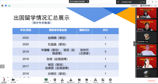 然后,张美为同学们进行了俄语语言文学方向的介绍,就硕导情况、开设课程、出国留学情况、员工就业形势等进行说明,带领同学们了解俄语教育行业的前景和赴俄留学的优惠政策,并叮嘱同学们要集中时间和精力投入到考研复习中,根据自身情况确定适合的复习方案,在专业知识复习方面要点面结合。