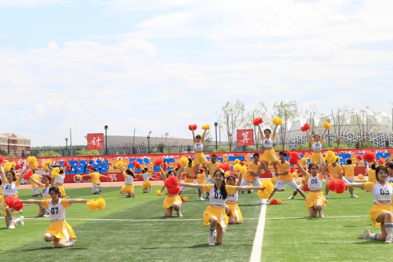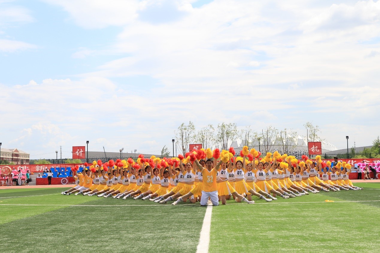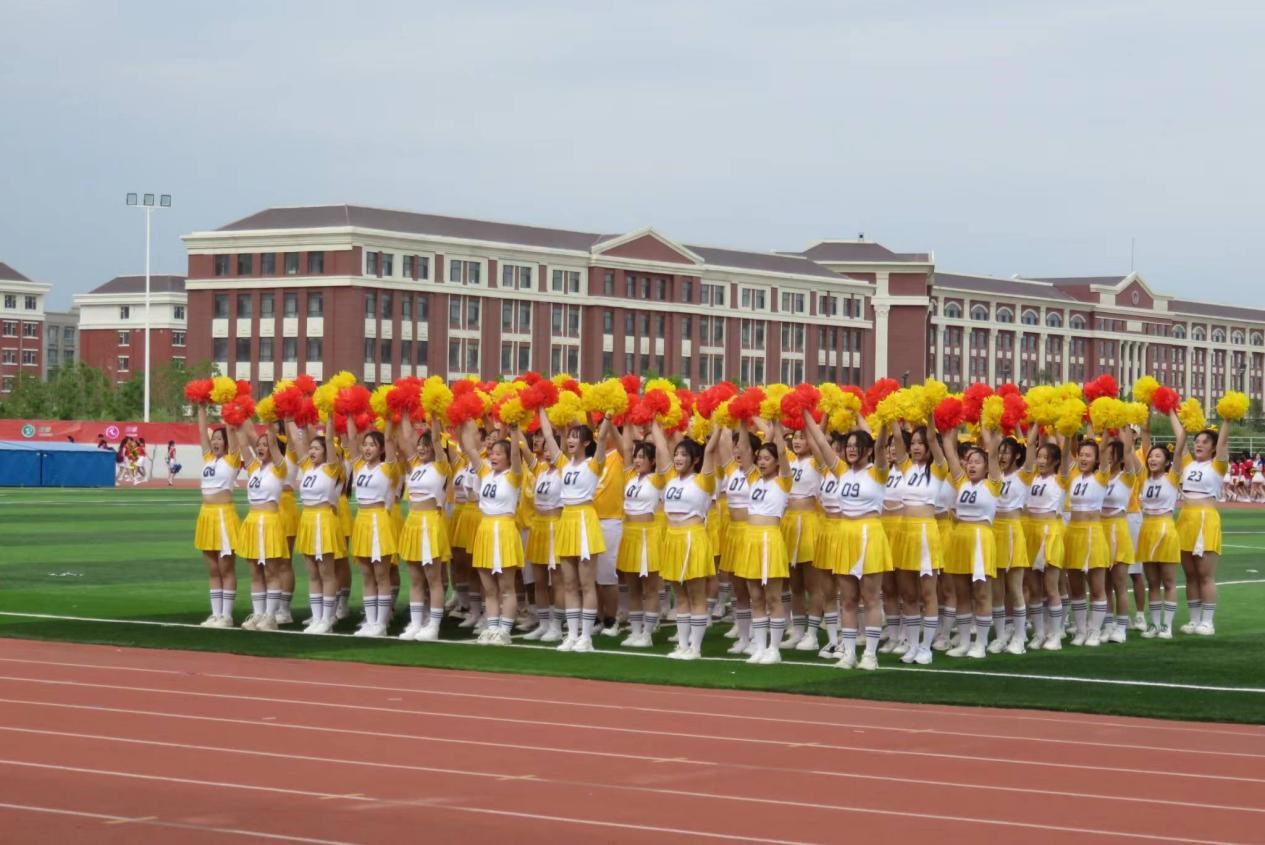 啦啦操比赛时,队员们踏着动感的音乐身姿优美,动作张弛有度。她们肆意地在绿茵草坪上跳动,呈飒爽英姿,试比天高。她们是青春的音符,浑身散发出了青春活泼的气质,完美地展现出了啦啦操的魅力。