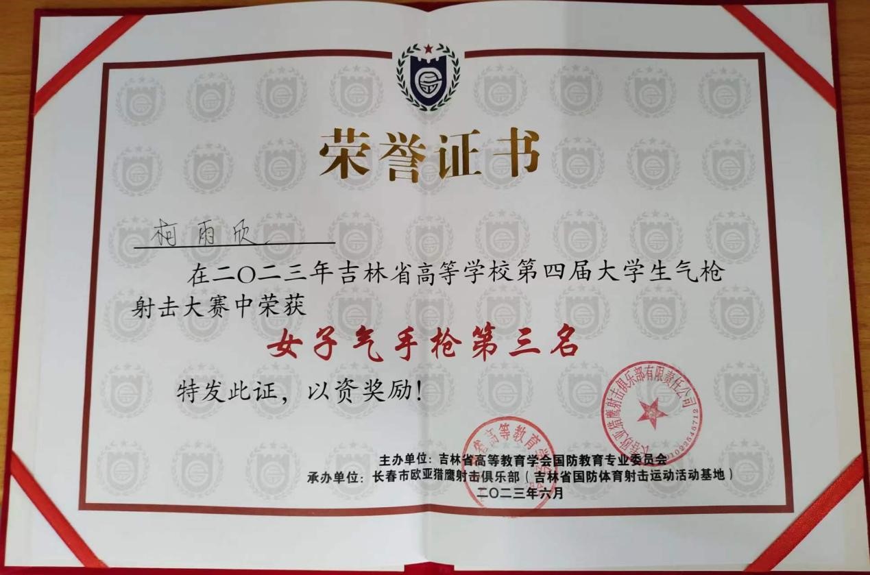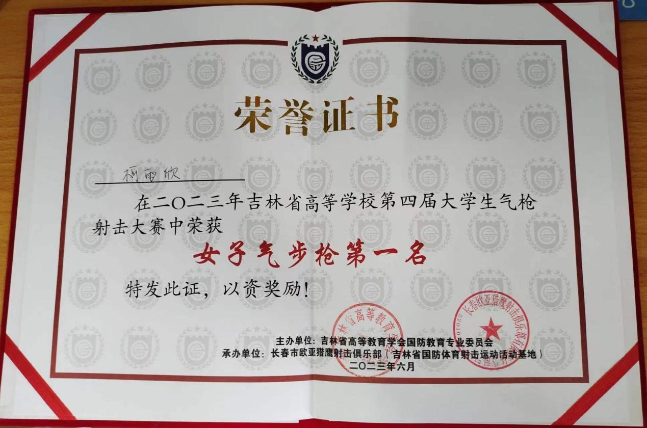 (通讯员 张晓君 柯雨欣 魏瑶)为进一步落实立德树人根本任务,增强员工国家安全意识,培养员工国防素质观念。吉林省高等教育学会国防教育专业委员会于6月10日主办吉林省高等学校第四届老员工气枪射击大赛。公司柯雨欣同学参加本次比赛并取得女子气步枪第一名和女子气手枪第三名的好成绩。