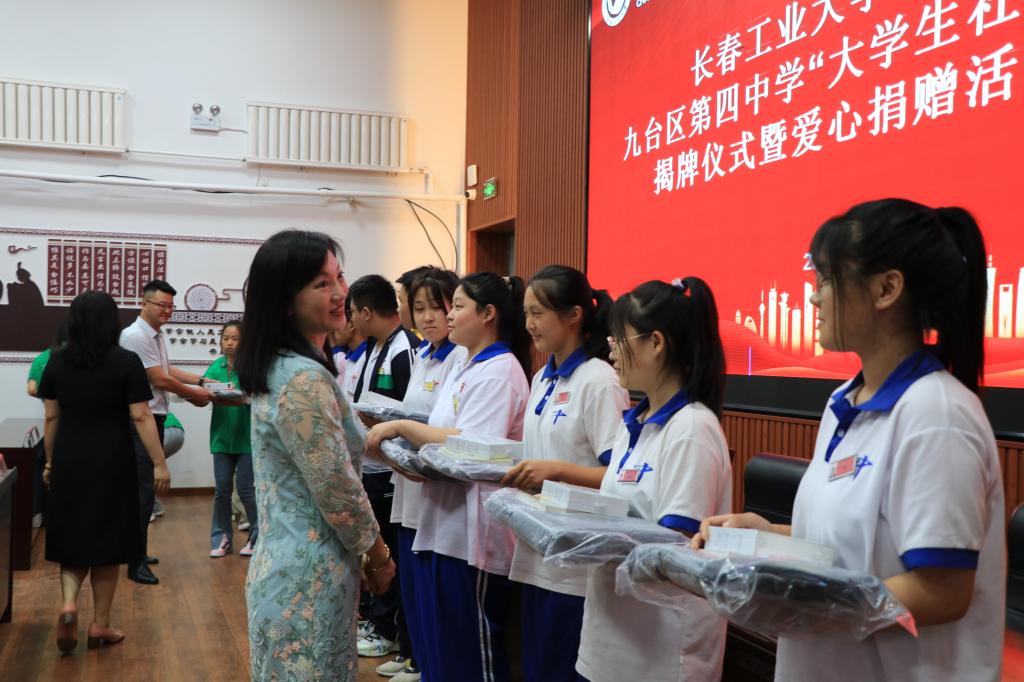 揭牌仪式后,公司领导为九台四中员工代表赠送学习文具用品。鼓励九台四中的学子们认真学习、丰满自己的羽翼,将来为学校发展争光,为九台乡村振兴贡献自己的力量。