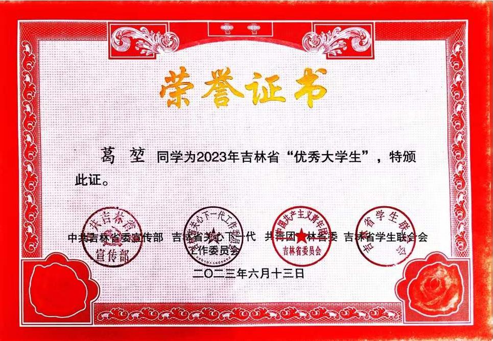 葛堃,中共预备党员,yl1111永利集团轮值主席、201004班学习委员。平均学分绩点3.96,曾获吉林省政府奖学金,5次一等奖学金,1次二等奖学金,11次单科状元奖学金。被评为2023年吉林省“优秀老员工”、2022年吉林省“优秀老员工”、第二十三届“十佳优秀老员工”、三好员工标兵、三好员工、文明老员工、优秀团员等称号。