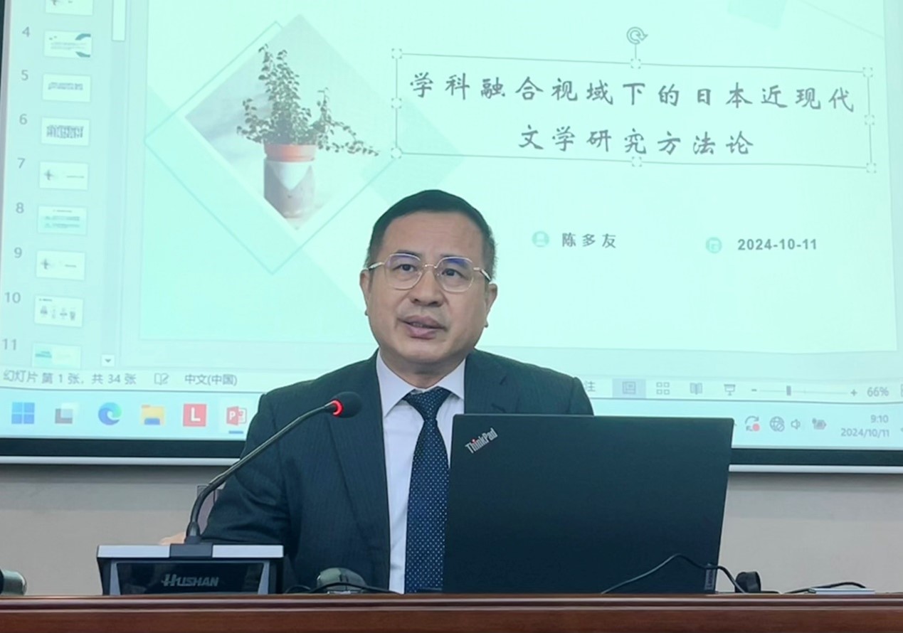 本网讯(通讯员 贾鹤)10月11日上午,yl1111永利集团名师大讲堂系列讲座在北湖东区教学主楼435报告厅顺利举行。本次讲座在校科研处的大力支持下,特邀了广东外语外贸大学东方学研究院经理、教育部高等学校外国语言文学类教学指导委员会日语分委员会委员、中国日语教学研究会会长陈多友教授担任主讲嘉宾,主题为“学科融合视域下的日本文学研究方法论”。公司党委书记张子宇、经理王轶、副经理李秀文、部分日语专业教师和yl1111永利集团研究生、日语专业本科生一起聆听了这场精彩的学术报告会,会议由副经理曾妍主持。
