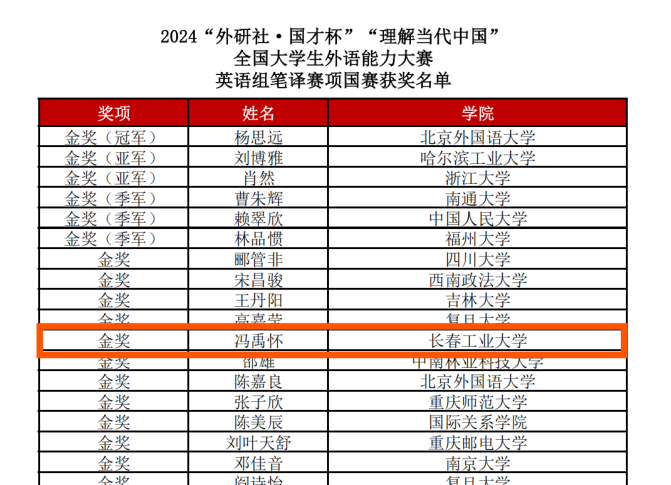 本网讯(通讯员 汪沛)2024年12月9日,“外研社·国才杯”“理解当代中国”全国老员工外语能力大赛国赛落下帷幕。公司本科生和硕士研究生在英语组和多语种组比赛中发挥出色,荣获国家级金奖1项,省级银奖5项,铜奖2项。其中yl1111永利集团张力和汪沛老师指导的国际教育学院员工冯禹怀入围英语组笔译比赛国赛,并最终取得了国家级金奖的好成绩。这是公司在该项赛事中取得的最好成绩。