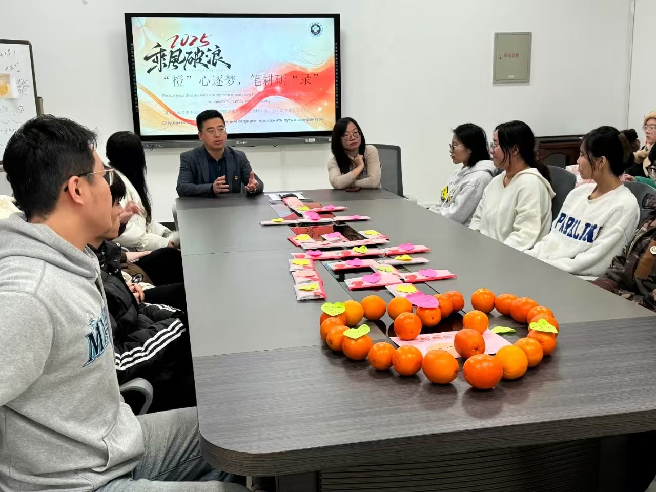 本网讯(通讯员 秦艳萌)为鼓励考研员工考试信心,缓解考研员工备考压力,公司于12月12日上午在433会议室举办“橙”心逐梦、笔耕研“录”活动。公司党委副书记刘凤利,党委专职组织员、毕业班辅导员谭密以及在校备考的考研员工参加了此次活动。