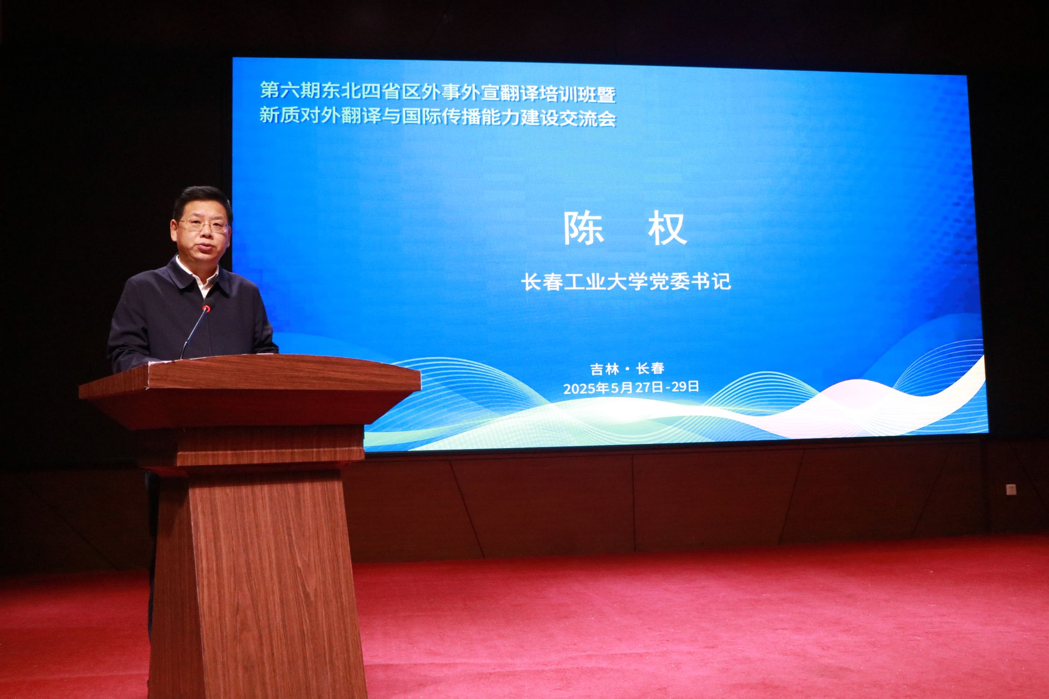 公司党委书记陈权代表学校致辞,对联合主办单位的信任与支持表示感谢,并介绍了学校的发展概况。同时指出,本次培训班与交流会,正是立足时代之需、发展之要,旨在以“新质翻译力”赋能国际传播实践,以专业交流碰撞思想火花,为外事工作者与高校教师搭建共学、共研、共进的平台。