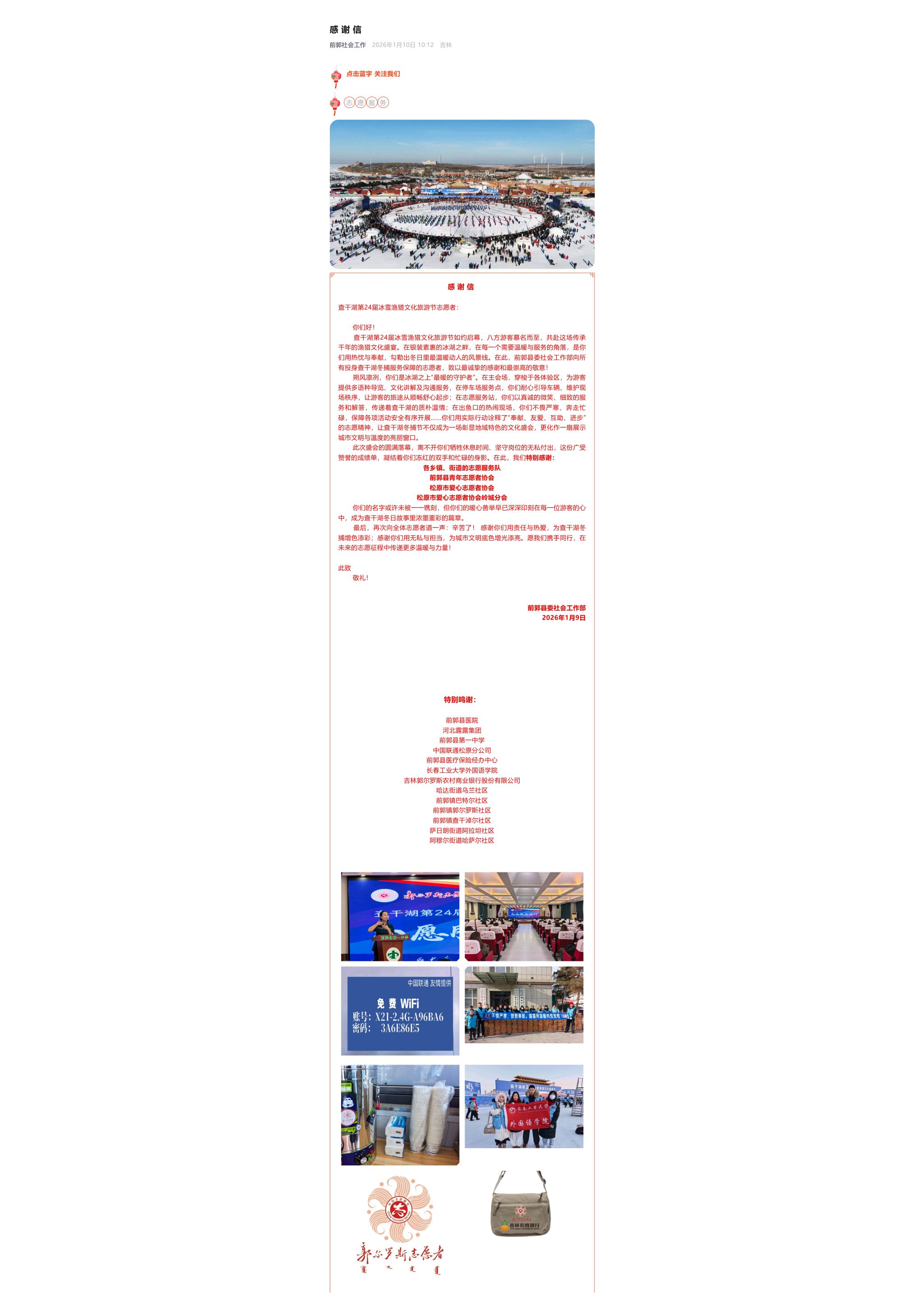 本网讯(通讯员 金一鸣)为深入落实学校“三访三促”工作相关部署,推动实践育人与地方发展深度融合,公司主动对接松原市相关部门,精心选拔优秀员工承担多语种语言志愿服务工作。1月8日,公司员工投身查干湖第24届冰雪渔猎文化旅游节开幕式,以专业翻译能力为盛会助力添彩,相关事迹获松原市官方媒体报道,学院收到相关部门的感谢信。
